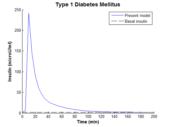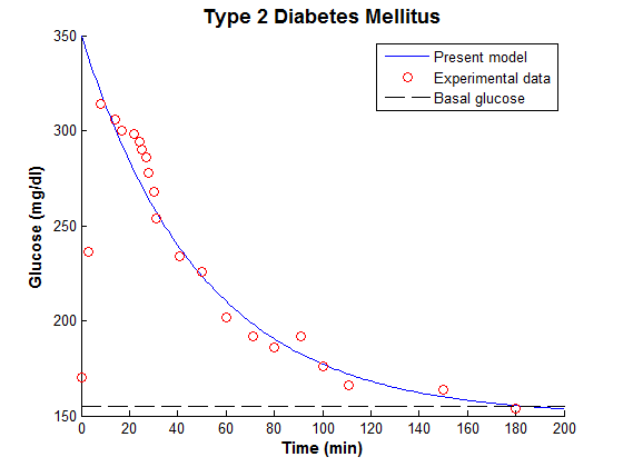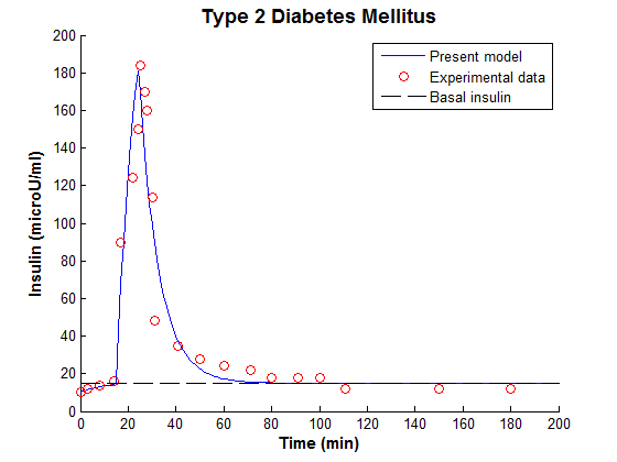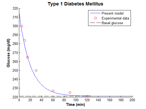 We had carried out a simple simulation experiment of modified MM applied to the identified T1DM experimental data. The simulation conditions at present during IVGTT have been replicated-identified model received the equal amount of glucose (see fig. 4). The situation of T1DM was shown in fig. 4. In the modified minimal model, the blood glucose concentration of the T1DM subject returned to the basal lines more than 1 h regardless of the insulin injection. In T1DM case, both the experimental and calculated glucose concentrations showed a small response to the insulin infusion. For the blood insulin, besides the peak caused by stimulation by a glucose injection, there was a large peak after 5 min because of the insulin injection. The values of R2 = 0.970 for glucose between experimental and calculated plasma concentrations indicate that the simulation using the proposed model was agreed.