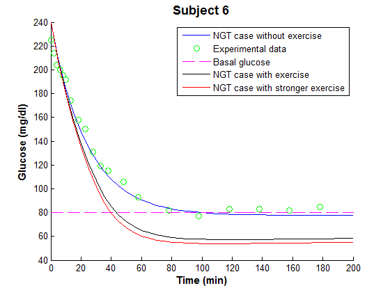 The parameters for the effects of exercise on glucose-insulin dynamics were proposed by Derouich and Boutayeb in 2002 [6]. The parameters related to physical exercise are defined as follows: the effect of the physical exercise of accelerating the utilization of glucose by muscular and the liver, the effect of the physical exercise in increasing the muscles and liver sensibility to the action of the insulin, and the effect of the physical exercise in increasing the utilization of the insulin [6].