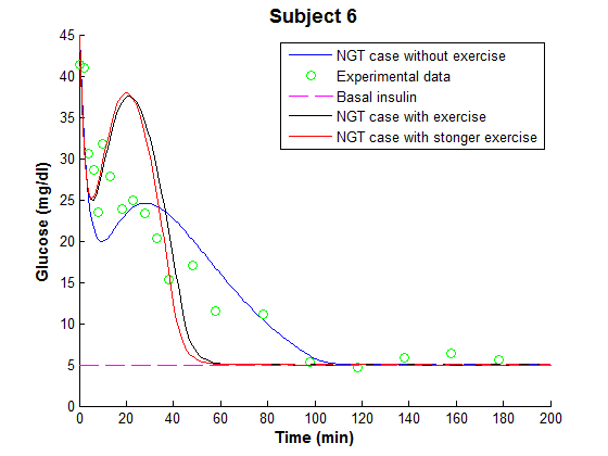 In T2DM cases without exercise, the IVGTT experimental and calculated plasma glucose and the plasma insulin profiles were shown in fig. 5, the blood glucose takes more than 2 h to return to the basal line in spite of an insulin infusion for 5 min starting at 20 min. In fig. 5, there was a great insulin peak from 20 to 30 min, because an insulin amount was injected. The proposed model described well the actual IVGTT operation and reached the R2 values of 0.930 for plasma glucose and 0.930 for insulin.