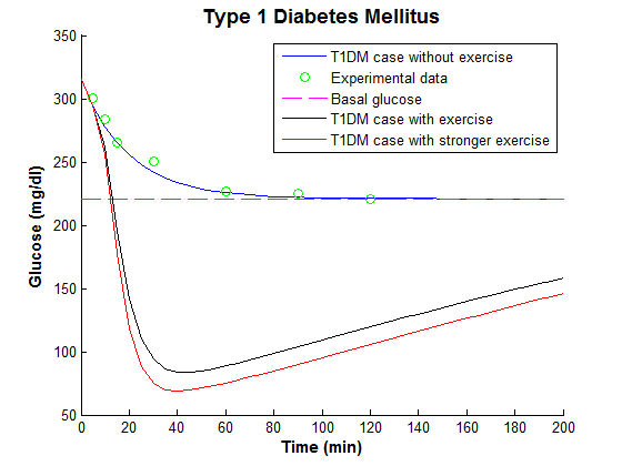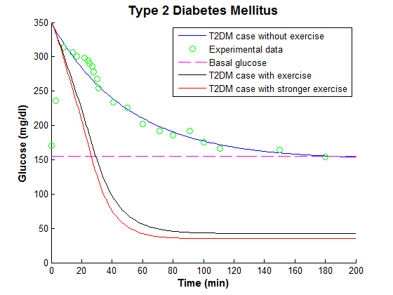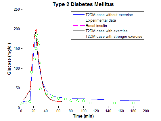 In this case, a modified MM with exercise was developed to capture the effects of exercise on glucose and insulin dynamics. The model successfully captured insulin-glucose concentrations during and immediately after physical exercise. The model was also capable of predicting the plasma glucose excursion towards hypoglycemia during prolonged exercise periods.