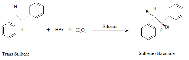 To a solution of trans-stilbene (1.8g, 0.01 mol) in glacial acetic acid(20 ml) was added a mixture of sodium bromide (3 g, 0.029 mol) and sodium bromate (1 g, 0.008 mol) at room temperature with occasional stirring by a glass rod for 1 hour. The light brown color which developed during stirring disappeared. The acetic acid present in the reaction mixture was neutralized by the addition of sodium hydroxide solution. The precipitate of stilbene dibromide were filtered and dried to give 80% yield (2.6 g) [7].