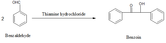The conventional condensation of benzaldehyde to yield benzoin involves highly poisonous sodium cyanide (NaCN) which has been replaced by environmentally friendly thiamine hydrochloride.
