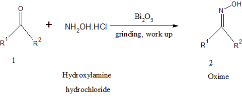 A mixture of aldehyde/ketone 1 (1*10-3 mol), hydroxylamine hydrochloride (1.2*10-3 mol), and bismuth oxide (Bi2O3) (0.6*10-3 mol) was grounded in pestle mortar (Scheme 7). Completion of the reaction was monitored through thin layer chromatography, and ethyl acetate (2 × 10 ml) was added to the reaction mixture. Filtration of the reaction mixture was done to remove the Bi2O3. The filtrate was concentrated, and water was added which separated the product from the solution. The precipitates were filtered and dried in vacuum to give the pure oxime 2 in 60-98% yield (Scheme 7) [28].