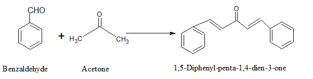 Benzaldehyde (3.8 ml, 36*10-3 mol), acetone (1 ml, 48 mol) and methylated sprit (or alcohol) (15 ml) were shaken together for 2 min in a conical flask fitted with guard tube. To it was added 30 ml of 10% sodium hydroxide solution and was shaken vigorously for 10 min with simultaneous pressure release. The cooling of the reaction mixture was done in ice and the pale yellow solid was filtered, washed with water, dried, collected, weighed [yield: 3 g (90%)] and recrystallized using ethanol, m. p. (120-122 °C) [29].