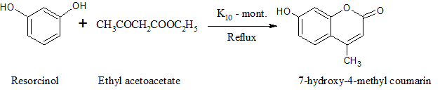 Resorcinol (1.1 g, 0.01 mol) was dissolved completely in ethyl acetoacetate (1.35 g, 0.01 mol) in a 50 ml dry flask to which K10 montmorillonite clay (1.5 g) was added and mixed thoroughly using a glass rod (Scheme 10). The reaction mixture finally appeared as a paste, was placed on a hot water bath for 3-4 h. After cooling the reaction mixture, 7-hydroxy-4-methylcoumarin was extracted with ether. The clay was removed by filtration through filter paper (Whatmann 4). After evaporation of filtrate, the product was obtained as a white solid in 85% Yield (1.5 g) having a melting point at 180 °C [32].