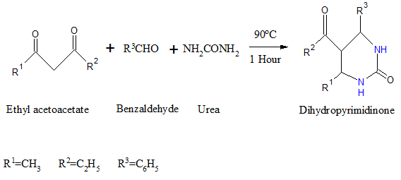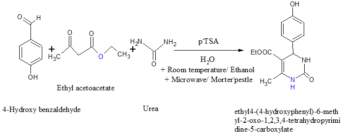 4-hydroxybenzaldehye (0.122 g, 1*10-3 mol), ethyl acetoacetate (0.127 ml, 1*10-3 mol) and urea (0.132 gm, 2*10-3 mol) was taken in a conical flask, ethanol (5 ml) as a solvent and p-toluene sulfonic acid (p-TSA, 0.034g, 2*10-3 mol) were added simultaneously to the above mixture. The mixture was irradiated for 3 min (30-second interval at 20 power level). After completion of the reaction, the reaction mass was poured on ice and the precipitated solid was filtered, washed with water, oven dried and the crude product was crystallised in water and glacial acetic acid.