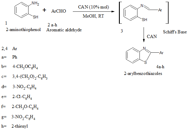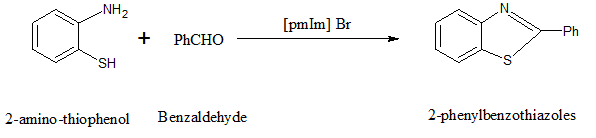 A mixture of benzaldehyde (1.0 g, 10*10-3 mol) and 2-amino-thiophenol (1.25 g, 10*10-3 mol) was heated in a microwave oven (10% power, 120 W) in the presence of ionic liquid, 1-pentyl, 3-methyl imidazolium bromide (pmlm Br, 500 mg) for 3 min (Scheme 23). After cooling the reaction mixture was extracted with ether and the ether extract was evaporated to give the crude product which was recrystallized using ethanol-water (4:1) to give a white solid having a melting point 112-115 °C in 90% (1.9 g) yield. This ionic liquid, [pmIm] Br works here as a catalyst as well as the reaction medium, without any involvement of solvent and the reaction is also atom efficient [55].