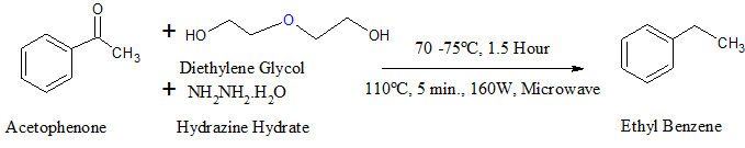 The conventional procedure involves refluxing at 75 °C for one and half hour. 10 ml acetophenone (0.29 mol), 30 ml diethylene glycol (0.085 mol), 9 ml hydrazine hydrate (0.54 mol) and KOH pellets under microwave irradiation in 5 min at 110 °C temperature and 160-watt power resulted into ethyl benzene (Scheme 16). The reaction mixture was transferred to a separating funnel and lower aqueous layer was discarded. The aqueous layer was extracted with 10 ml ether. Excess ether was removed by heating on a water bath. The resultant mixture was dried with anhydrous magnesium sulphate (MgSO4) and a yellowish solution with gasoline like smell was obtained 135-139 °C in 74% yield [48].