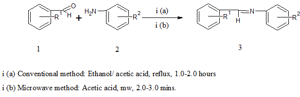 The synthesis of Schiff bases 3a–f was accomplished by the reaction of aromatic aldehydes (1, 10*10-3 mol) and different aromatic amines (2, 10*10-3 mol) along with the catalytic amount of glacial acetic acid under microwave radiations (Scheme 18, table 2). The conventional method required about 1.0–2.0 h, while microwave irradiation method required only 2.0–3.0 min [50].