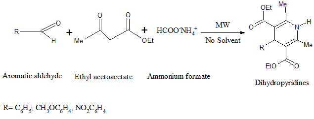 In a typical general procedure, a mixture of 1.0 molar equivalent aldehyde, 1.3 molar equivalent ammonium formate, and 2.2 molar equivalent ethyl acetoacetate in a flask (Scheme 19) fitted with a calcium chloride drying tube was irradiated in a microwave oven (2450 MHz, 300 W, Brand BPL, India) for the stipulated period of time having the installment of 15 seconds each and intermittent cooling. The reaction mixture was cooled to room temperature and thoroughly mixed with crushed ice. The precipitated solid was filtered, washed with water and dried. Recrystallization from aqueous alcohol yielded the pure product dihydropyridines (table 3) [51].