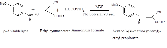 p-anisaldehyde (1.32 g, 10*10-3 mol), ethyl cyanoacetate (1.13 g, 10*10-3 mol) and ammonium formate (630 mg, 10*10-3 mol) were mixed in a round-bottomed flask fitted with guard tube and placed on a bed of alumina taken in a beaker (Scheme 20) and was subjected to microwave irradiation for 90 seconds (with an installment of 30 seconds each at a power level of 300 watts followed by intermittent cooling). After completion of the reaction, the mixture was cooled to room temperature, and crushed ice (20 g) was added. The solid product, which precipitated in a granular form, was filtered, washed well with water and dried to give ethyl 2-cyano-3-(4’-methoxyphenyl)-propionate (1.84 g, 80%).