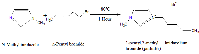 N-Methyl imidazole (1.2 g, 15*10-3 mol) and n-pentyl bromide (2.71 g, 18*10-3 mol), taken in a small round bottom flask fitted with a guard tube (Scheme 24), were heated in water bath at 80 °C for about one hour. A clear yellow viscous liquid which was formed, cooled and washed with a small amount of ether (1 ml) twice to remove any unreacted bromide and remaining viscous liquid was dried by a vacuum pump to yield-3.42 g (88%) of 1-pentyl, 3-methyl imidazolium bromide (pmlmBr).