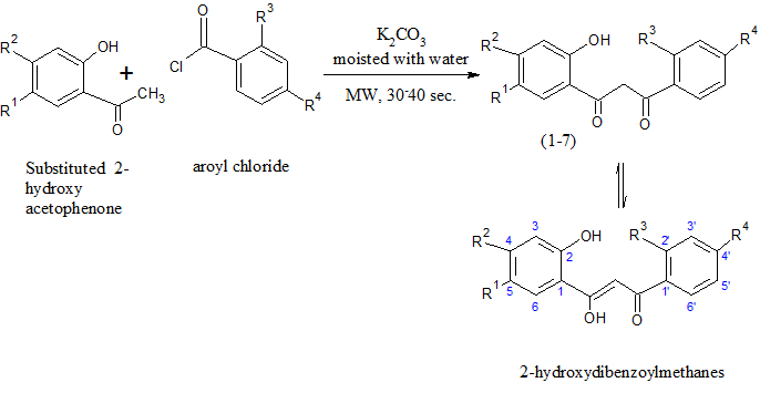 A mixture of substituted 2-hydroxyacetophenone (2*10-3 mol), aroyl chloride (2*10-3 mol) and potassium carbonate (10*10-3 mol) homogenised by the addition of 8-10 drops of water was subjected to microwave irradiation for 30 (5x6) seconds (Scheme 25, table 5).