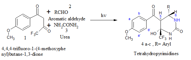 A mixture of 4, 4, 4-trifluoro-1-(4-methoxyphenyl) butane-1,3-dione 1 (5*10-3 mol), different aromatic aldehydes 2 (5*10-3 mol) and urea 3 (5*10-3 mol) was irradiated under microwave at the power of 600 W at 110-120 °C. (table 6, Scheme 26). After cooling, the solid was washed with cold water, filtered and dried under vacuum to yield the crude product which on recrystallization from hot ethanol provided the pure product [57].