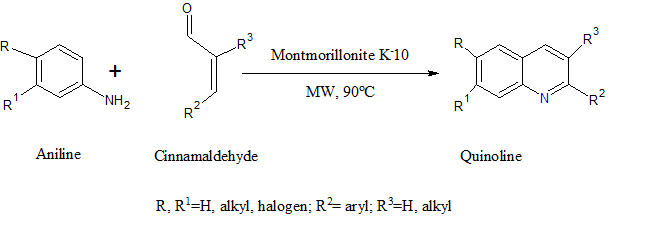 Montmorillonite K-10 is a stable, inexpensive, strong, solid acid which is commercially available heterogeneous catalyst active under microwave which causes a reduction in solvent use. De Paolis et al., (2009) [58] have pronounced an environmentally friendly microwave-assisted solid acid-catalyzed synthesis of quinolines from anilines and cinnamaldehydes. The catalyst montmorillonite K-10 guarantees effective condensation, cyclisation and aromatization to the final product. In this one-pot process, the solvent-free cyclization and oxidation steps readily take place (Scheme 27). The yield of product was found to be 95% when reactant ratio: aniline (1.5*10-3 mol) and cinnamaldehyde (1*10-3 mol) were used.