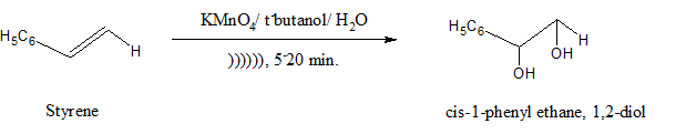 In a typical experiment, styrene (208 mg, 2*10-3 mol) was added to the finely powdered KMnO4 (474 mg, 3*10-3 mol). To this mixture, tertiary butanol (1 ml) was added which was followed by water (15-20 ml) and the reaction mixture was irradiated by using Ultrasonic processor (Heat systems-Ultrasonics, Inc., W-380) (Scheme 29).