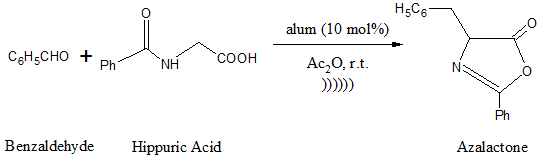 Benzaldehyde (2*10-3 mol), hippuric acid (2.2*10-3 mol), acetic anhydride (6.6*10-3 mol), and potash alum [KAl(SO4)2.12H2O] (10 mol %) mixture was irradiated under ultrasound irradiation at ambient temperature for 8 min. The yellow solid which precipitated on the addition of 5 ml of 95% ethyl alcohol, was filtered, washed with hot water and recrystallized with acetone/water to give azlactone in 96 % yield and had a melting point 168–170 °C (Scheme 30) [63].