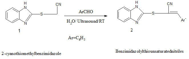 To a mixture of 2-cyanothiomethylbenzimidazole, 1 (10*10-3 mol), benzaldehyde (10*10-3 mol) in water (20 ml) was added under constant sonication parameters. The reaction progress was monitored by thin layer chromatography and after 10 minutes (Scheme 31), the reaction was found to be completed. The mixture was filtered and dried. Recrystallization of crude product was done from ethyl acetate to obtain product 2 in 98% yields having a melting point 192-194 °C [64].