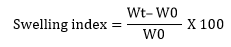 The swelling index of tablets was determined by placing the tablets in 100 ml beaker of HCl solution (pH1.2) and the temperature of the medium is maintained at 37±0.5 °C. And then after 1, 2, 3, 4 and 5 h, each beaker containing tablet was withdrawn and blotted with tissue paper to get rid of the excess water and weighed on the analytical balance. The swelling behaviour of the tablet was determined by measuring the difference in weight of the tablet before and after placing it in HCl solution (pH 1.2). Swelling index was calculated by utilise the following equation [20].