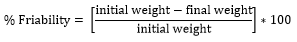 Weigh twenty tablets and placed them in the friabilator and the device was rotated at 25 rpm for (4 min). After revolutions, the tablets then de-dusted and weighed again. The acceptable percentage weight loss or % friability should be ˂1%. The percentage friability was determined by using the following formula: [16].
