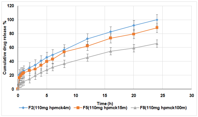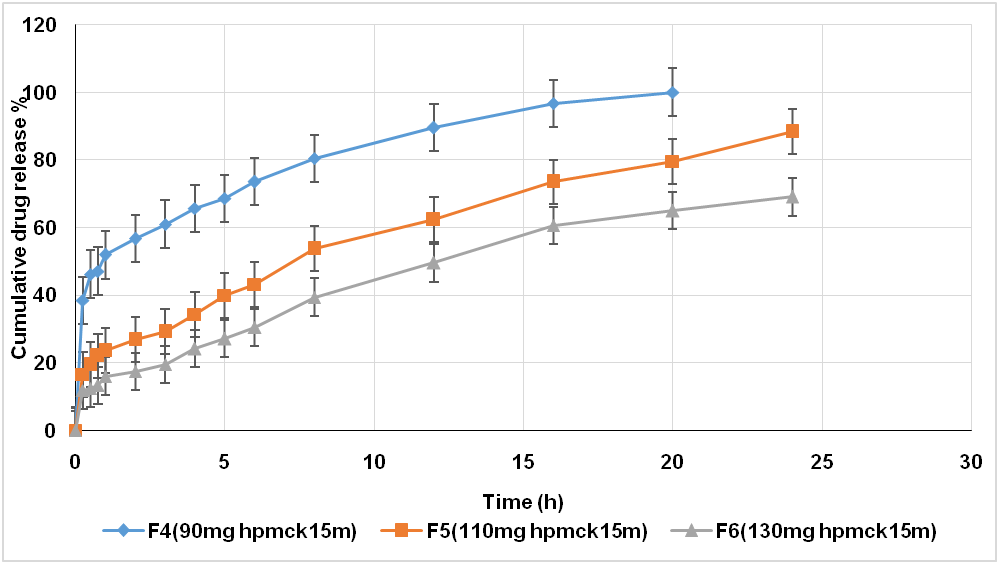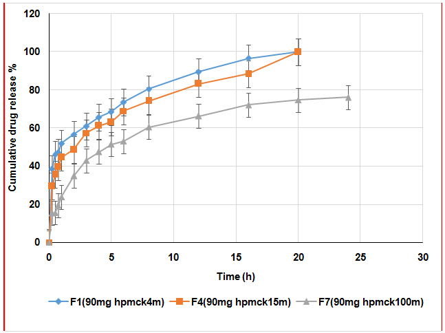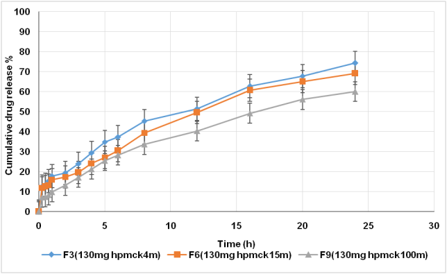 While fig. (4, 5, and 6) shows the effect of polymer concentration on drug release in which as the concentration of polymer in the formula increases, the rate of drug release decrease significantly٭, This indirect relationship between polymer concentration and drug release is due to the fact that higher polymer concentration will forming a stronger viscous gel layer that decrease the rate of water diffusion into the floating tablet matrix, which cause decrease drug release [32].