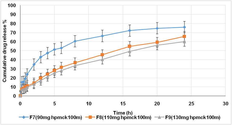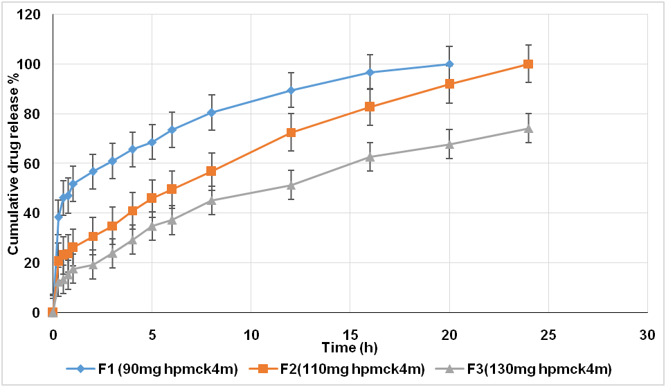 Fig. 6: The effect of HPMC K100M polymer concentration on the release of prochlorperazine maleate floating tablets in HCl solution pH1.2 at 37 °C, Data represent mean (±SD) (n=3)
