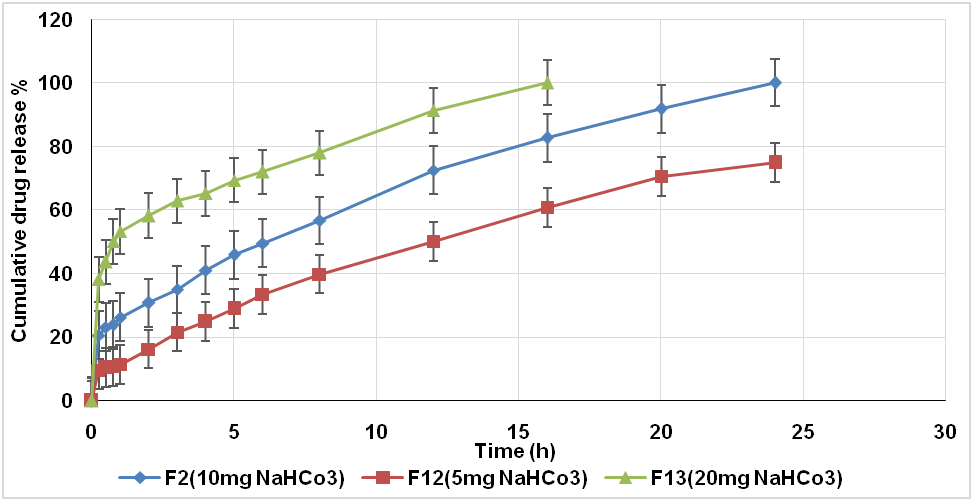 Formulas 2, 12, and 13 which contain 10 mg, 5 mg, and 20 mg of sodium bicarbonate (NaHCo3) respectively were utilised to study the influence of the concentration of effervescent agent on the release profile and floating properties of floating tablet.