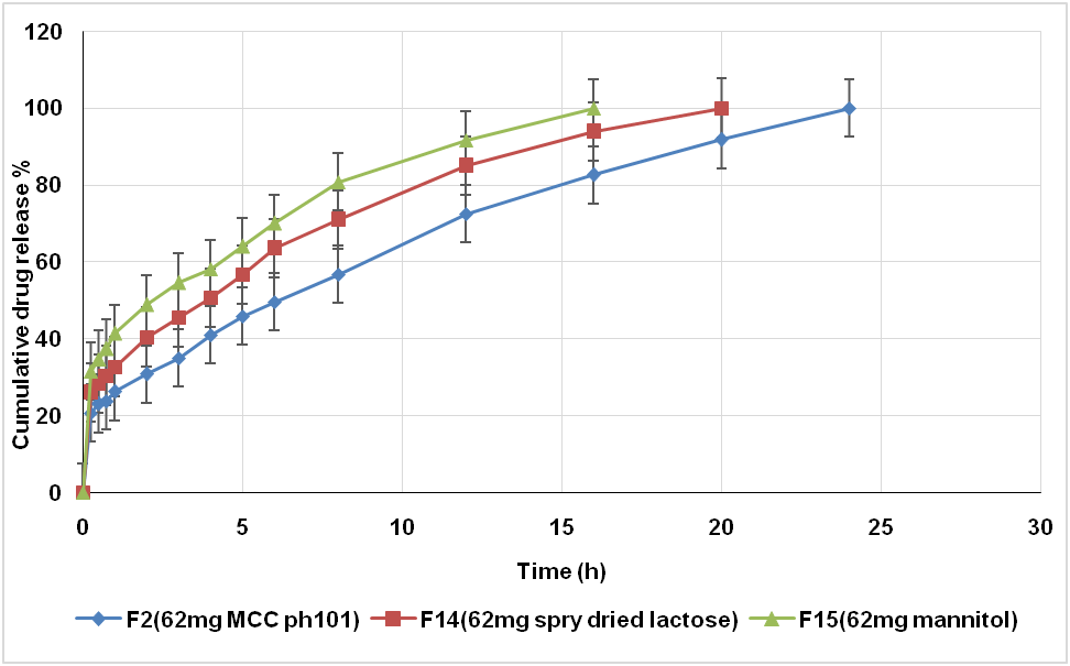 The effect of diluent type on floating properties found that formula 2 which contain avicel Ph101(MCC) showed longer floating lag time and total floating time than F14 which contains spry dried lactose (SDL) and this show longer floating lag time and total floating time than F15 which contains (mannitol) due to that both lactose and mannitol are water soluble in nature, while MMC is hydrophobic in nature, this property accelerates the penetration of dissolution medium to matrix lead to floatation of the prepared floating tablet in a short period of time [28].