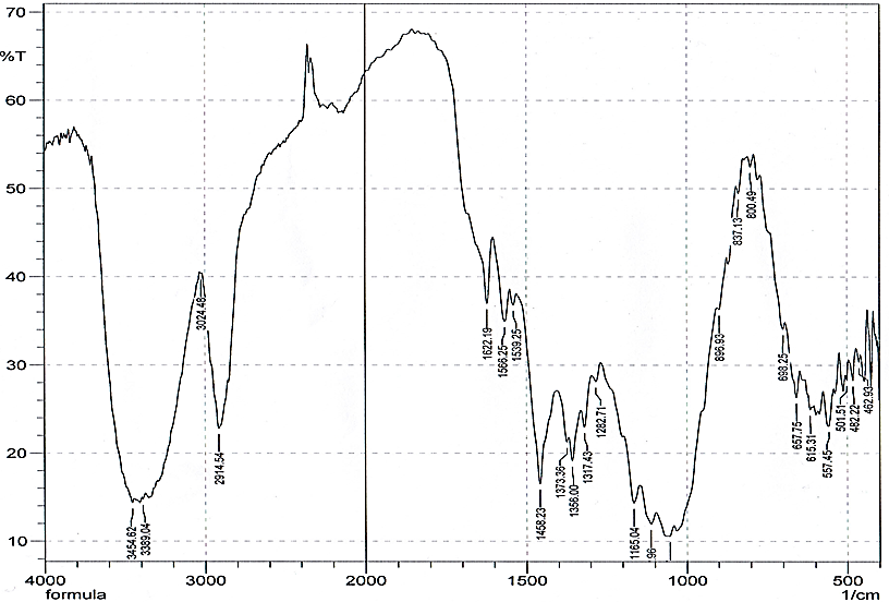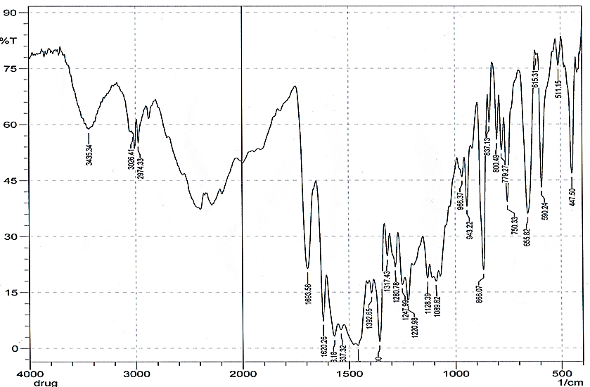 The band appeared at 1568 cm-1attributed to (C=C) of the aromatic ring. The band appeared at 1089 cm-1 attributed to (C-Cl) stretching in the benzene ring. While the fingerprint area showed the bending bands of the drug.