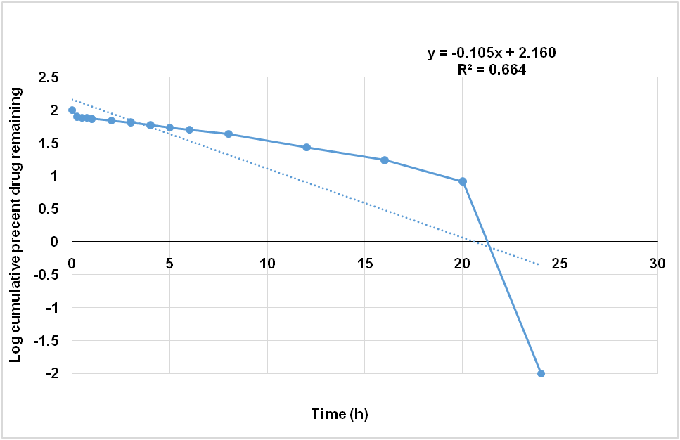 The kinetic model had described drug dissolution from solid dosage form where the dissolved amount of drug is a function of test time. In order to determine the precise mechanism of prochlorperazine maleate release from the prepared floating tablets, drug release data was analysed according to first order, Higuchi square root, zero order, and Korsmeyer-Peppas models. The criteria for selecting the most suitable model were chosen on the basis of goodness of fit test. The data were treated for regression analysis utilising MS EXCEL statistical function [23].