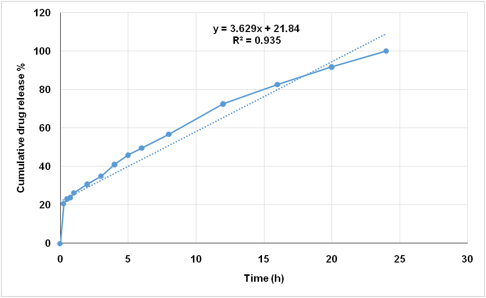 The results of the study shows the in vitro release of the drug could be best expressed by Higuchi’s equation as the optimised formula showed good linearity (R2: 0.9889) and that indicates the diffusion is a dominant mechanism of drug release with this formula.