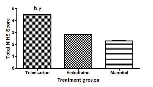 Fig. 1: Statistical significant difference of total NIHSS Score among treatment groups, Superscript “b” denotes significance of telmisartan at P<0.01 versus amlodipine; superscript “y” denotes significance of telmisartan at P<0.01 versus mannitol