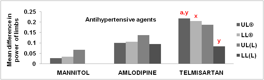 Telmisartan showed significant improvement of power in right UL compared to amlodipine (P<0.05) and mannitol (P<0.01). However, improvement of power in right LL was observed with telmisartan compared to mannitol (P<0.05). Significant improvement of power in left LL was observed in telmisartan compared to mannitol (P<0.01). This is represented in fig. 2.