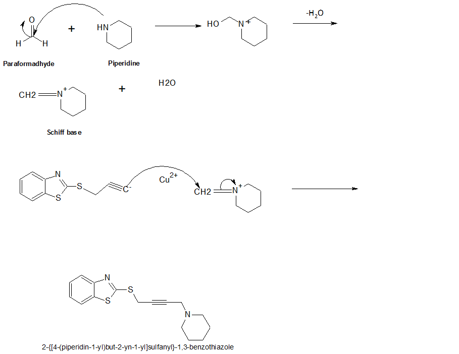 A mixture of 2-(prop-2-yn-1-ylsulfanyl)-1,3-benzothiazole (AZ0) (2.062 g, 0.01 mol), Para formaldehyde (0.5 g in excess), cyclic amine (1-methylpiperazine, 2-methyl piperidine, 2,6-di methyl piperidine, azepane, pyrrolidine, piperidine) and a catalytic amount of cuprous chloride in 1,4-dioxane (25 ml) was stirred at room temperature for 10 min then was heated and stirred under reflux at 70-75 °C for three h. Reaction mixture was filtrated and concentrated under reduced pressure to give brown syrup which was dissolved in diethyl ether, filtrated and concentrated under reduced pressure. The final products were AZ1, AZ2, AZ3, AZ4, AZ5, and AZ6.