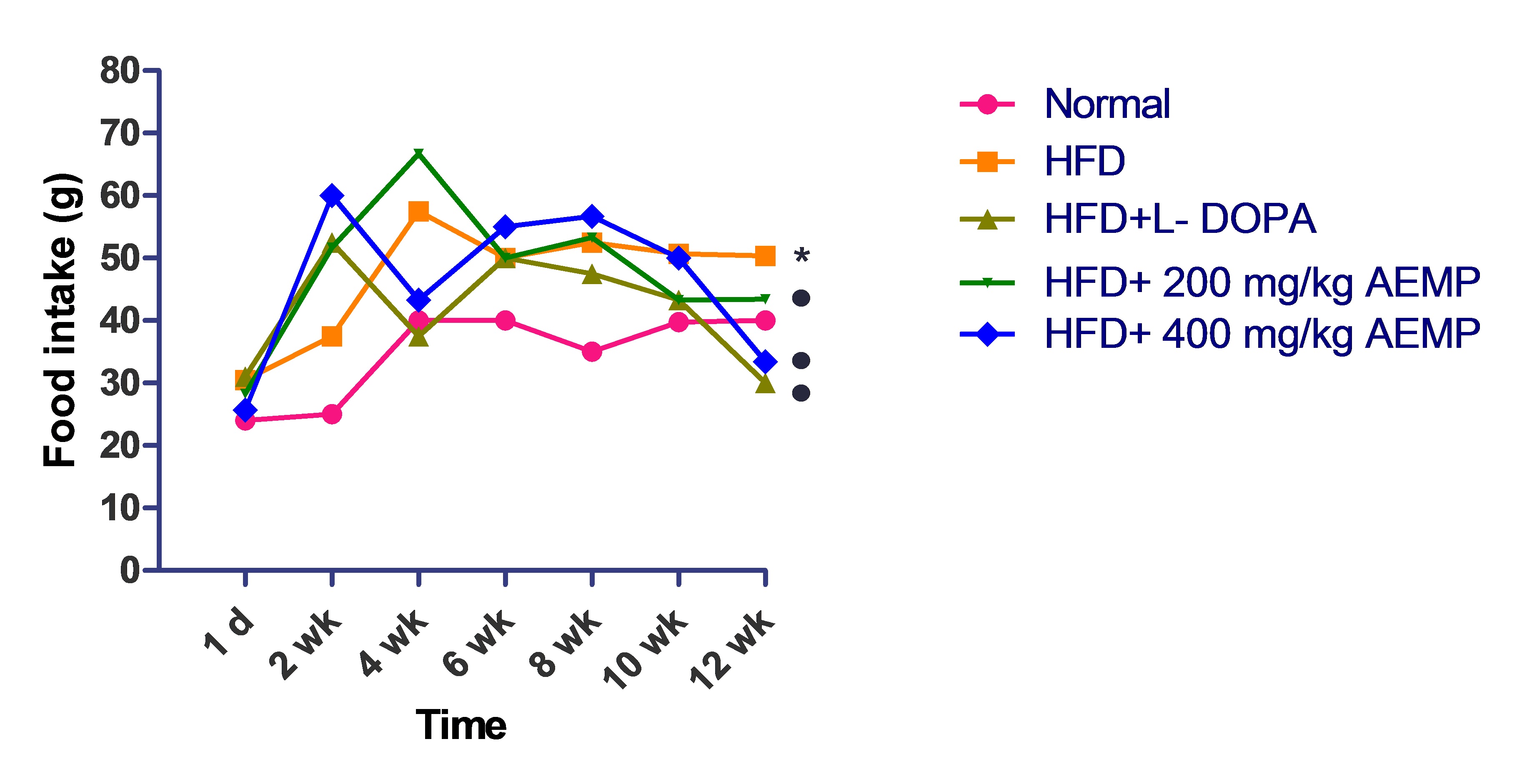 Fig. 1: Effect of L-DOPA and AEMP on food intake, Each line represents the mean±SEM, n=6;* p<0.05 compared with normal group after 12 wk of induction of HFD; ● p<0.05 compared to Group II after 12 wk (analysed by two-way ANOVA followed by Bonferroni test)