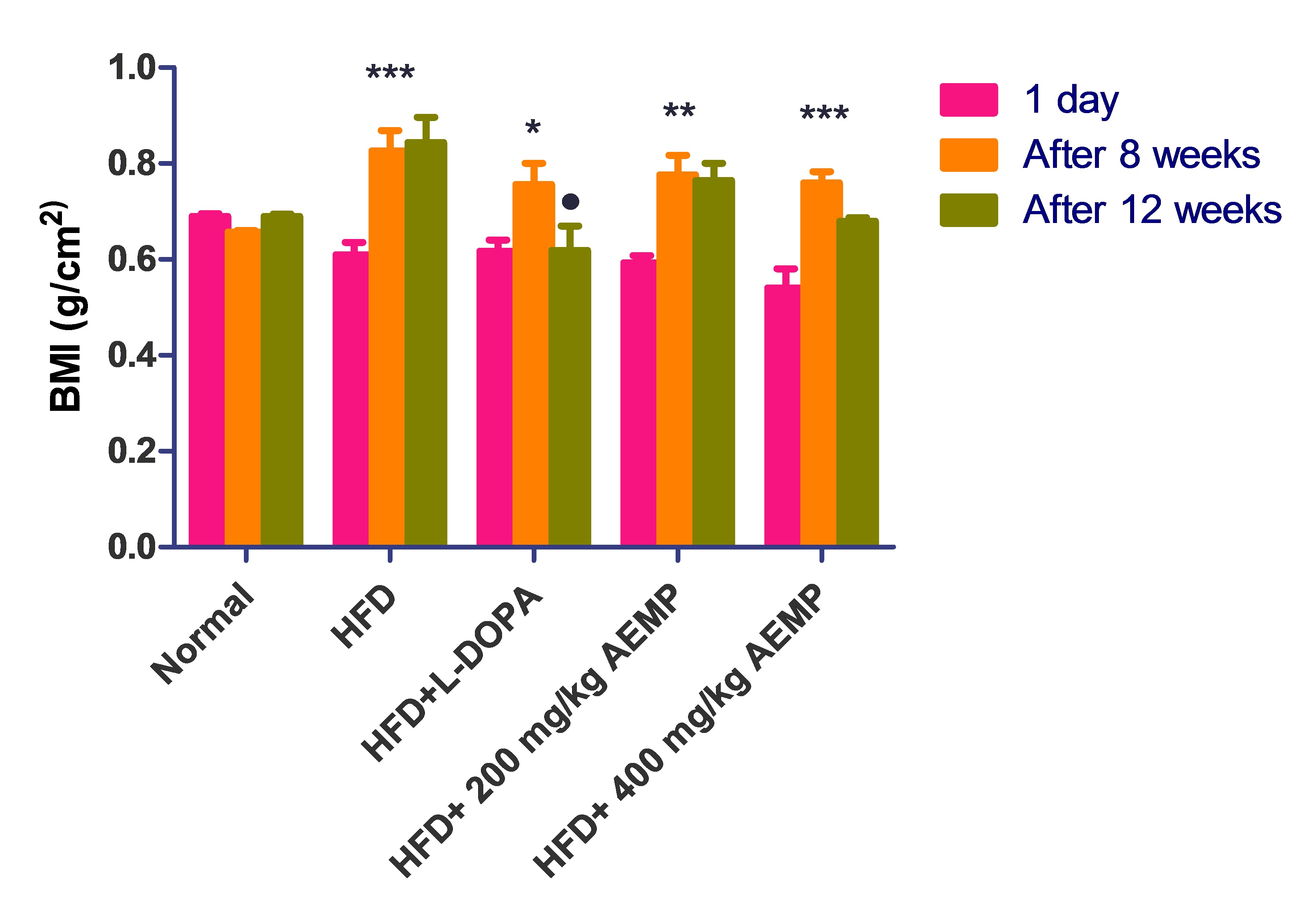 Fig. 2: Effect of L-DOPA and AEMP on BMI, Each Bar represents the mean±SEM, n=6;*** p<0.001 compared with the normal group after 8 wk of induction of HFD; ● p<0.05 compared to Group II after 12 wk (analysed by two-way ANOVA followed by Bonferroni test).