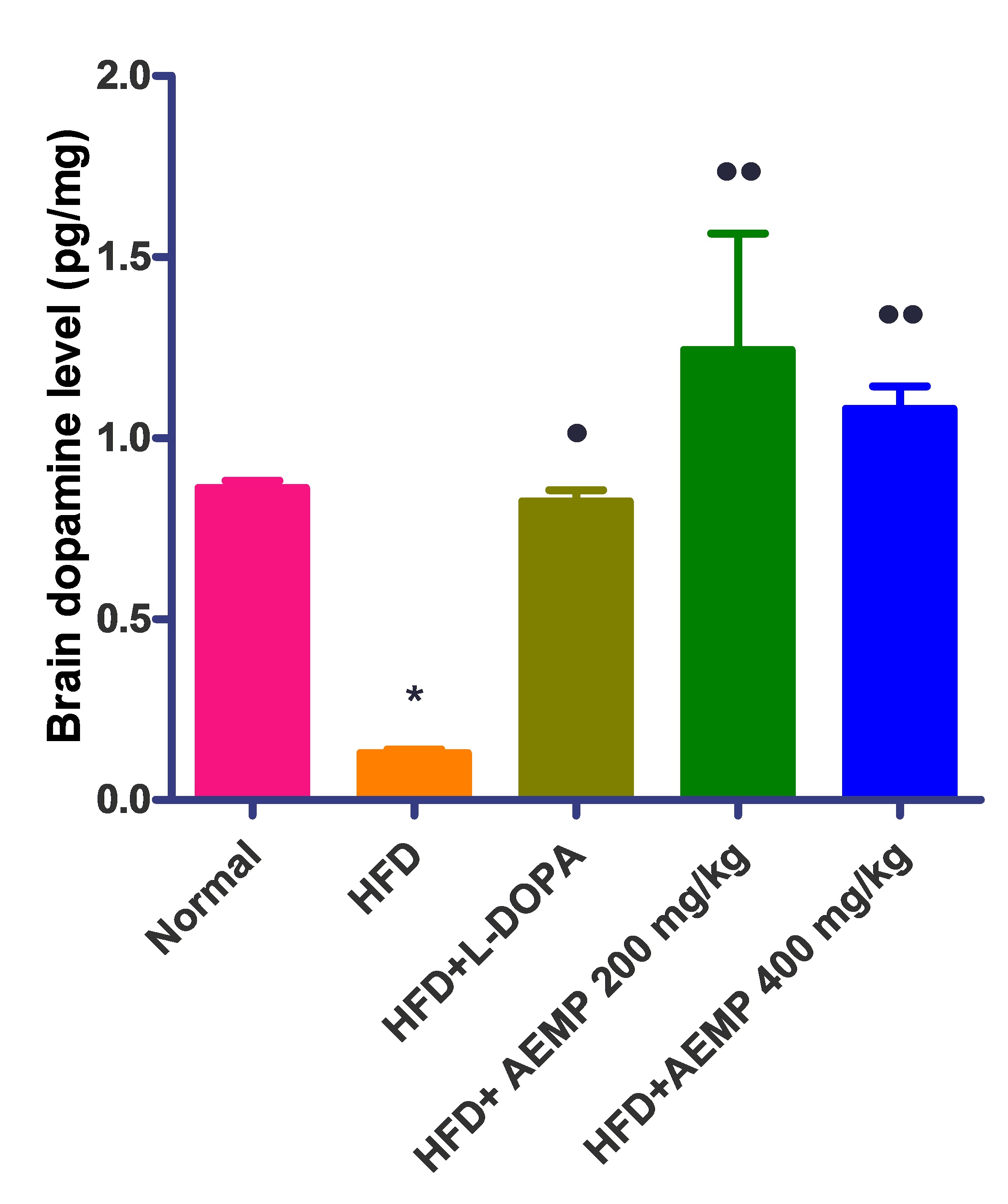 | Normal | HFD | L-DOPA | AEMP (200 mg/kg) | AEMP (400 mg/kg) | |
