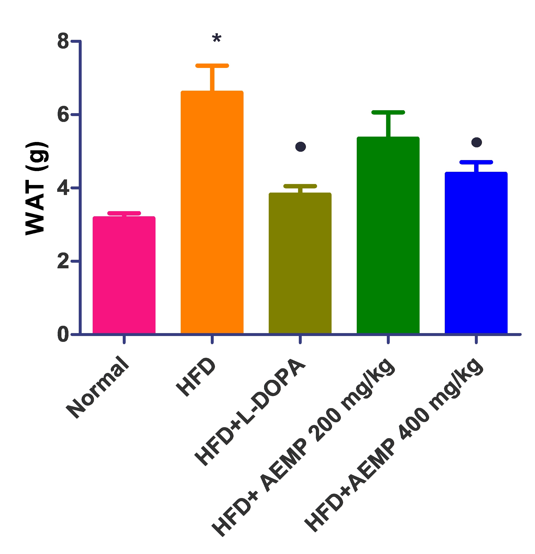 Fig. 4: Effect of L-DOPA and AEMP on white adipose tissue, Each bar represents the mean±SEM, n=6; *, p<0.05 compared to group I, ●, p<0.05 compared to Group II (analysed by one-way ANOVA followed by Tukey’s test)