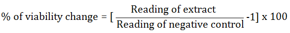 Cells were batch cultured for 10 d, then seeded at a concentration of 10x103 cells/well in fresh complete growth medium in 96-well microtiter plastic plates at 37 °C for 24 h under 5% CO2 using a water-jacketed Carbon dioxide incubator (Sheldon, TC2323, Cornelius, OR, USA). Media was aspirated, fresh medium (without serum) was added and cells were incubated either alone (negative control) or with different concentrations of the sample to give a final concentration of (100-50-25-12.5-6.25-3.125-0.78 and 1.56 µg/ml). After 48 h of incubation, the medium was aspirated, 40 µl MTT salt (2.5μg/ml) were added to each well and incubated for further four hours at 37 °C under 5% CO2. To stop the reaction and dissolving the formed crystals, 200μl of 10% Sodium dodecyl sulphate (SDS) in deionized water was added to each well and incubated overnight at 37 °C. A positive control which composed of 100µg/ml was used as a known cytotoxic natural agent which gives 100% lethality under the same conditions [22, 23]. The absorbance was then measured using a microplate multi-well reader (Bio-Rad Laboratories Inc., model 3350, Hercules, California, USA) at 595 nm and a reference wavelength of 620 nm. A statistical significance was tested between samples and negative control (cells with vehicle) using independent t-test by SPSS 11 program. DMSO is the vehicle used for dissolution of plant extracts and its final concentration on the cells was less than 0.2%. The percentage of change in viability was calculated according to the formula: