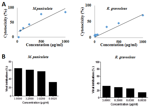 Fig. 1: Cytotoxicity (A) and antiviral (B) activities of M. paniculata and R. graveolens sterols
