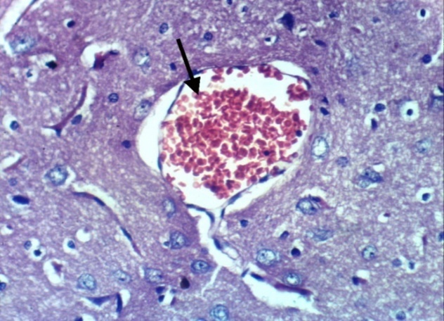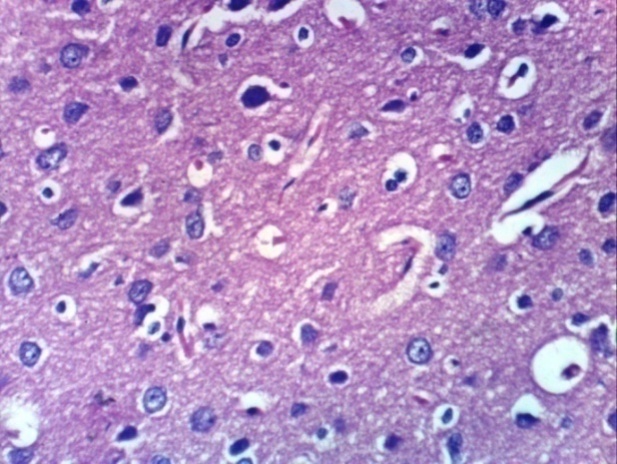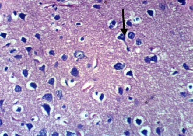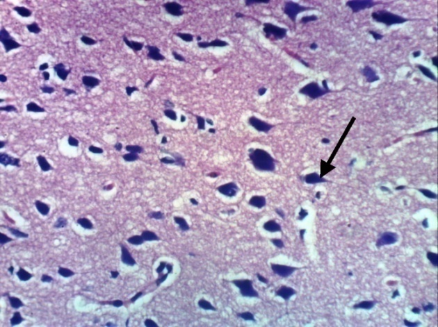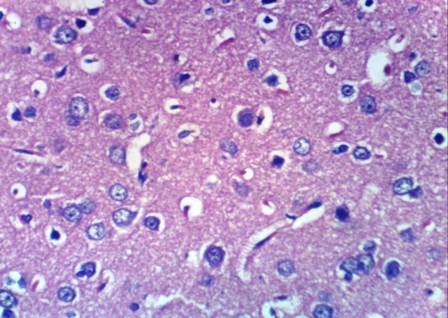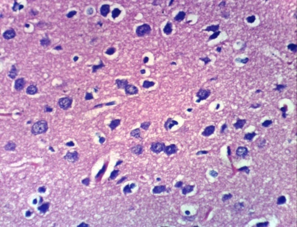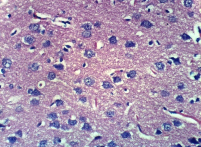 The brain tissue was fixed in 10 % formalin for one week, washed in running tap water for 24 h and dehydrated in ascending series of ethanol (50–90 %), followed by absolute alcohol. The samples were cleared in xylene and immersed in a mixture of xylene and paraffin at 60 °C. The tissue was then transferred to pure paraffin wax of the melting point 58 °C and then mounted in blocks and left at 4 °C. The paraffin blocks were sectioned on a microtome at a thickness of 5 μm and mounted on clean glass slides and left in the oven at 40 °C to dryness. The slides were deparaffinized in xylene and then immersed in descending series of ethanol (90–50 %). The ordinary haematoxylin and eosin (H and E) stain was used to stain the slides [23].