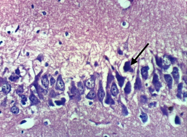 Histopathological investigation of cerebellum and hippocampus of AD rats in the present results revealed necrosis of neurons and multifocal cerebral haemorrhage in addition to necrosis of pyramidal cells. While AD rats treated with neuronophagia of sporadic necrotic neurons and necrosis in the cerebellum as well as some necrotic pyramidal cells In accordance with the present results Salem et al. [1], showed severe congestion in the blood vessels with oedema in the meninges of AD-induced rats. While a micrograph of a brain section of AD-induced rats treated with rivastigmine showing no histopathological alteration in the hippocampus. These results are in agreement with the results of Bihaqia et al. [39], who showed the normal histological appearance of the brain cells treated with rivastigmine tartrate and revealed that rivastigmine reversed histopathological alterations caused by Al.