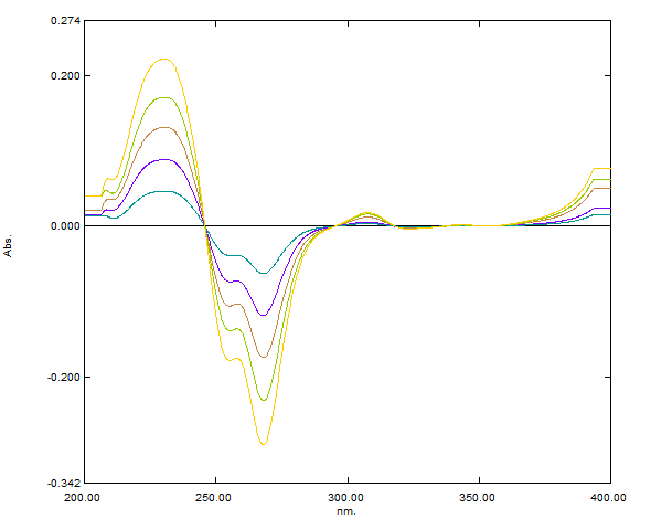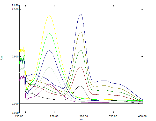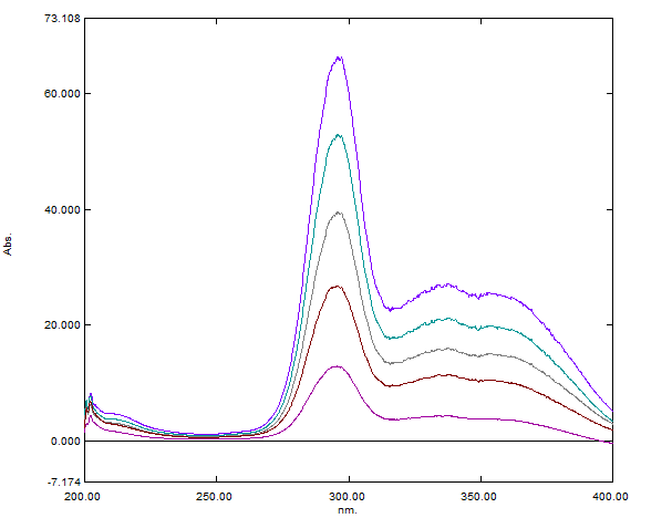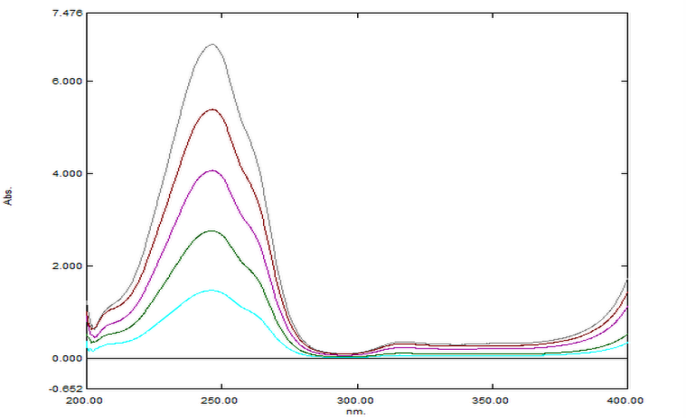 The method involves dividing the spectrum of formulation by the standardized spectra of each of the analyte and deriving the ratio to obtain spectrum that is dependent of concentration of analyte used as a divisor. Using appropriate dilutions of standard stock solution, the standard solutions of MH (6 μg/ml) and DIFLU (4 μg/ml) were prepared and their zero order spectra recorded over the range 200-400 nm using phosphate buffer pH 7.4 as blank. The ratio spectra of different MH standards at increasing concentrations were obtained by dividing each with the stored zero order spectrum of standard solution of DIFLU (4 μg/ml) and the first derivative of these spectra traced with the interval of Δλ= 8 nm, illustrated in Fig.4. Similarly, the ratio derivative spectra of the solutions of DIFLU at different concentrations were obtained by dividing each with the stored zero order spectrum of standard solution of MH (6 μg/ml) and the first derivative of these spectra traced with the interval of Δλ= 8 nm, illustrated in Fig.5. From Fig. 4 and 5, 325.80 nm and 238.0 nm as wavelength maxima (λmax) was selected for the simultaneous determination of MH and DIFLU in marketed eye drop formulation, respectively.