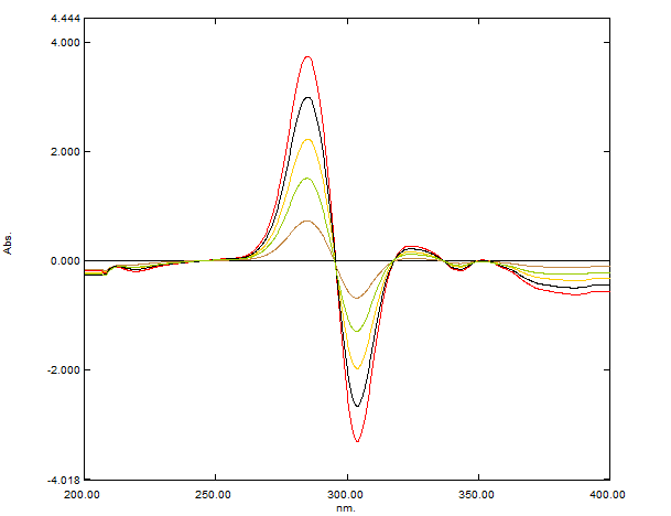 The ratio spectra of different MH standards at increasing concentrations in phosphate buffer pH 7.4 obtained by dividing each with the stored zero order spectrum of standard solution of DIFLU are shown in Fig.4 (a) and the first derivative of these spectra traced with the interval of Δλ= 8 nm are illustrated in Fig.4 (b). Similarly, the ratio derivative spectra of the solutions of DIFLU in different concentrations in phosphate buffer pH 7.4 traced with the interval of Δλ= 8 nm by using the zero order spectra of MH as divisor by computer aid is demonstrated in Fig. 5. Here, the standard spectra of 6.0 μg/ml of MH and 4.0 μg/ml of DIFLU were considered as suitable for the determination of DIFLU and MH respectively, as divisor. The Δλ found as optimum for the first derivative of their ratio spectra was 8 nm. From the Fig. 4 (b) and Fig. 5 (b), wavelength maxima 325.80 nm and 238.0 nm were selected for the determination of the MH and DIFLU respectively in the assay of pharmaceutical preparation, eye drops dosage form, due to its lower R.S.D. value and more suitable mean recovery.