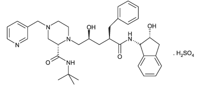 IUPAC name of Indinavir sulphate is [1(1S,2R),5(S)]-2,3,5-trideoxy-N-2,3-dihydro-2-hydroxy-1H-inden-1-yl)-5-[2-[[(1,1-dimethylethyl) amino] carbonyl]-4-(3-pyridinylmethyl)-1-piperazinyl]-2-phenyl methyl)-D-erythro-pentonamide sulphate (1:1) salt. The drug has a molar mass of 613.88 g/mol for the free base and 711.88 g/mol for the sulphate salt and is commercially available as capsules (trade name: INDIVAN) containing the equivalent of 400 mg of indinavir free base.