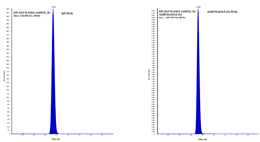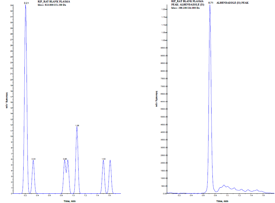The protonated molecular ion of [M+H]+, m/z823.8 were obtained for RIF and no significant solvent adduct ions or fragment ions were observed in the full scan spectra of RIF and albendazole (IS).Thus, it was decided to utilise positive ion mode for detection and quantification of [M+H]+ions and representative chromatogram showed in the fig.1 and 2.