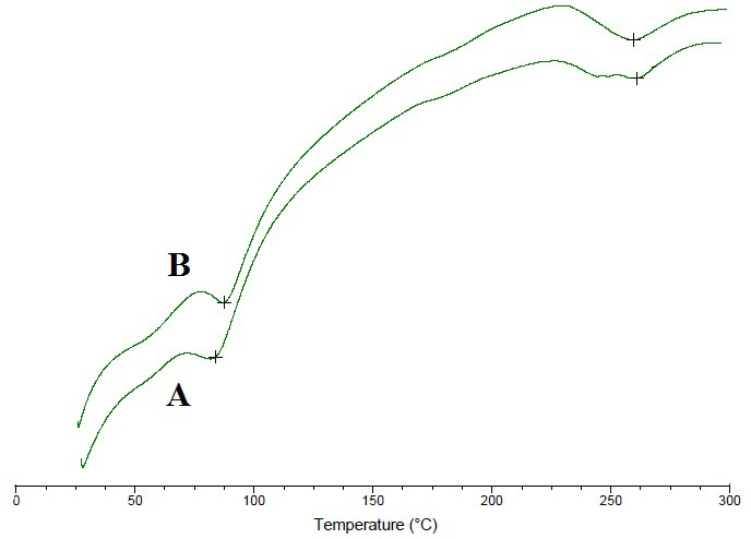 DSC thermogram of FDT (A) and pure drug (B) are presented in Fig 2. DSC thermogram of drug (B) showed a melting endothermic peak at 84.21 °C (may be hydrate peak), 178 – 191 °C (small dent with broad peak which may be due to melting of drug) and at 256.26 °C (degradation peak). The peak obtained from FDT was 82.44 °C, 175 – 190 °C and 259.46 °C indicating that drug peaks retained in the formulation hence no interaction between drug and excipients.