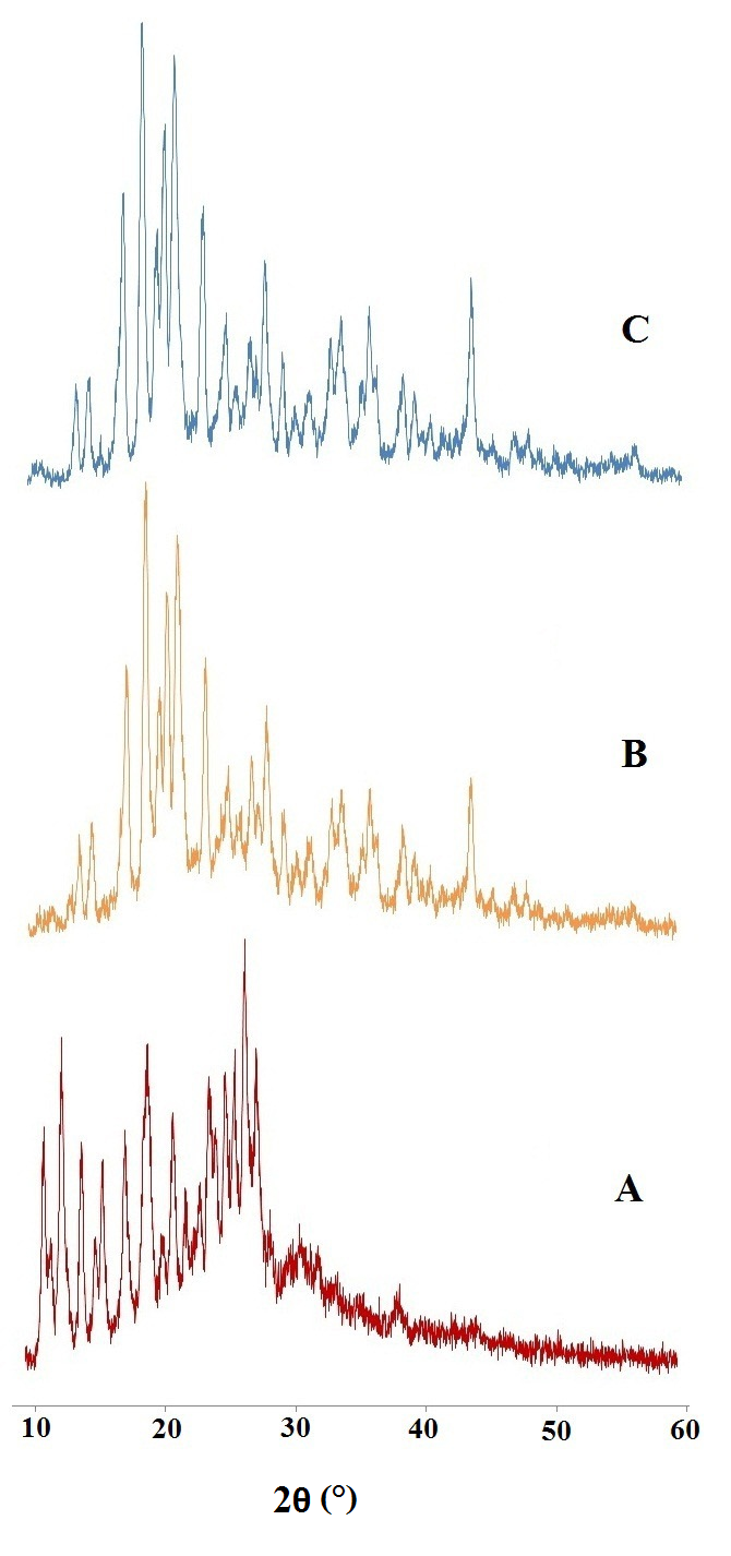 Fig. 4: X-ray diffractogram of pure drug (A), FDT formulation (B) and placebo tablet (C).