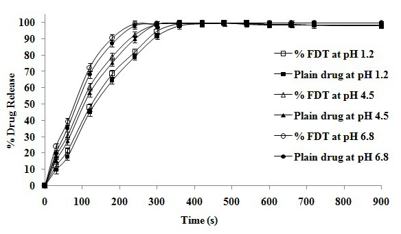 From the graphs it was clear that, FDT on comparision to plain drug released at similar rate, however the release profile was different between them i. e., FDT showed slightly faster release than plain drug which may be due to amorphozisation of the drug in the tablet. However there was no statistically significant difference in release (p < 0.05) between tablet and plain drug at a particluar pH medium. The release of F1, F2 tablet and plain drug analyzed at different pH medium was the following assending order: 6.8 > 4.5 > 1.2.