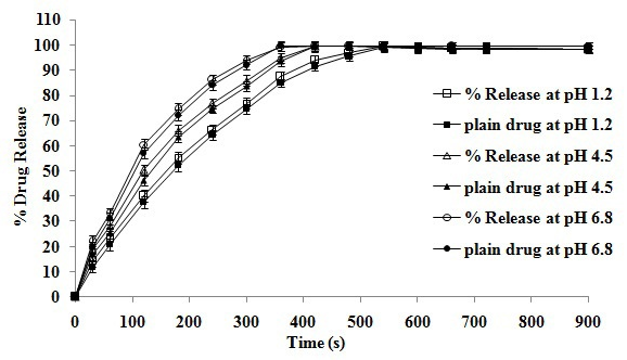 From the plot (Fig. 6) it was found that, ~ 95 % drug was released from F2 tablet and plain drug (equivallent dose as F2 tablet) within 360 sec at pH 6.8; whereas it took 420 and 480 s to release the drug at pH 4.5 and pH 1.2 respectively.